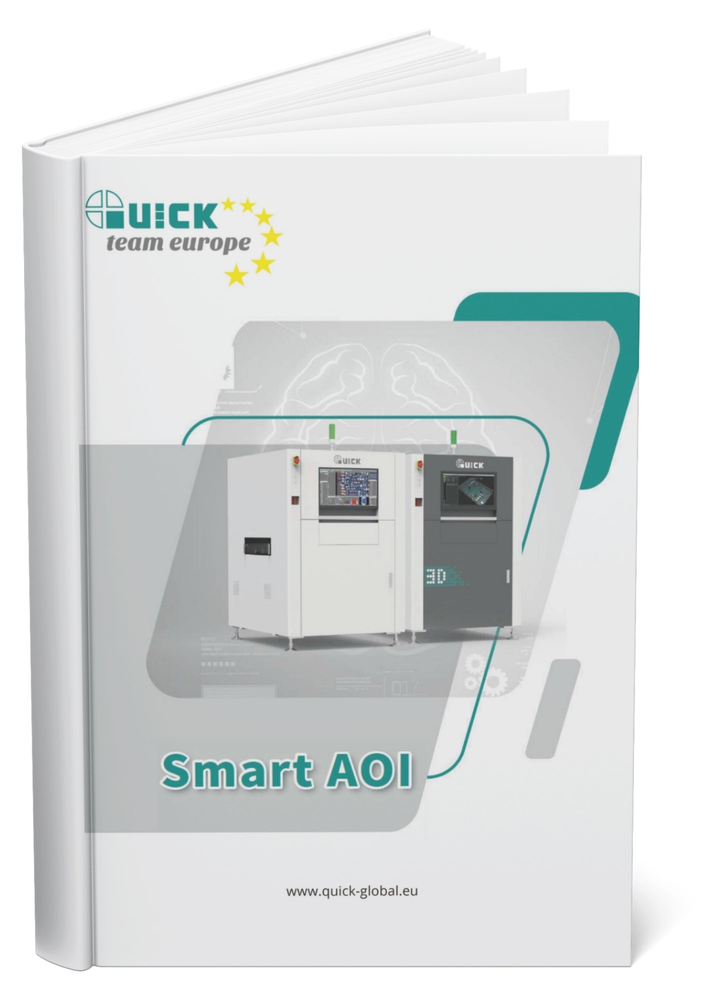 The catalog presents QUICK’s 2D and 3D AOI systems designed for SMT process control, reflow and wave soldering, and protective coating inspection. It contains an overview of available models, technologies used