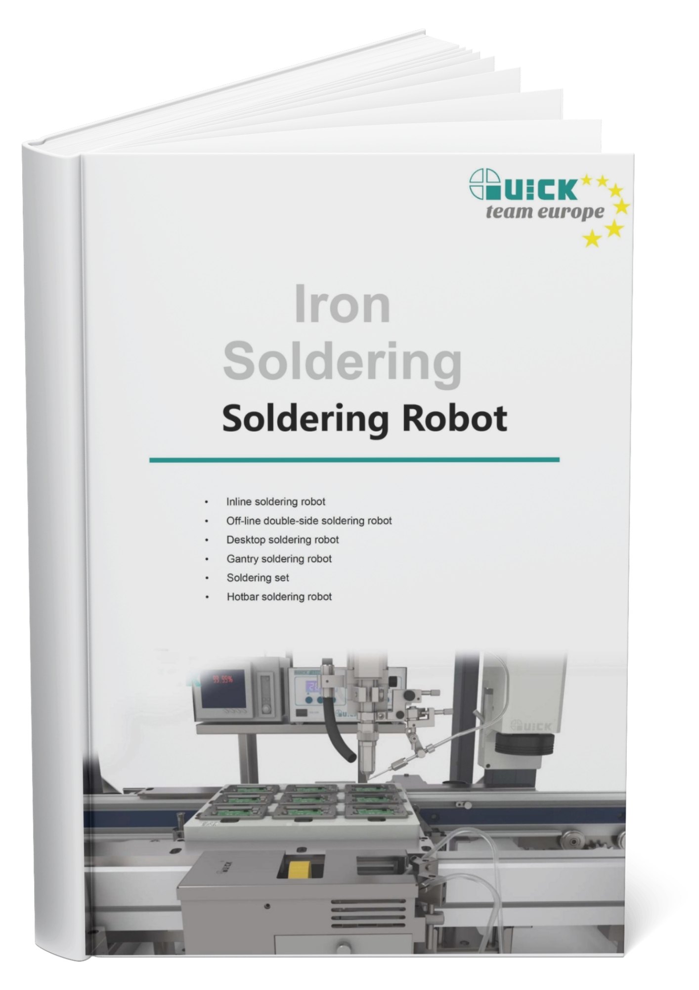 The catalog presents complete automatic soldering systems, including inline, offline, desktop, and gantry robots. It allows for quick comparison of available solutions and selection of a system for a specific production process.