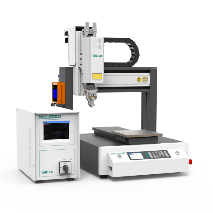 The QUICK LW10 uses a laser beam as a focused heat source and solder wire as the solder material. This makes it suitable for selective, contactless soldering where repeatability, thermal control and access to small solder joints are important.The system combines closed-loop temperature control, vision-assisted positioning, system temperature sensing and a coaxial optical path for process monitoring. It is designed for precise soldering processes in electronics manufacturing, especially where stable heat input and controlled solder wire feeding are required.Key features
